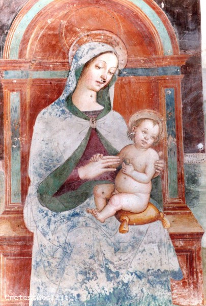 Di questo bellissimo affresco, eseguito a più mani, come appare chiaro, anche da una visione diretta, è abbastanza certa l'attribuzione ad artisti umbri. Secondo recenti studi, infatti la Madonna con Bambino, potrebbe essere di mano del Pinturicchio. Ma ciò che colpisce a prima vista è il volto adolescente e raffinato del giovane Sant'Ippolito, con mantello e spada, l'unico che si rivolge verso l'osservatore.