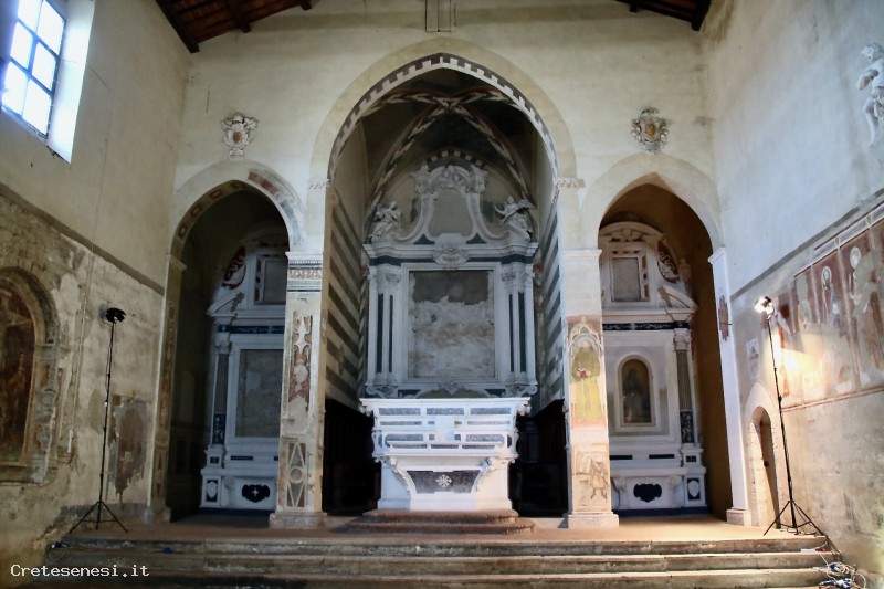 Oltre alla ricchezza di affreschi ancora da riscoprire in questa chiesa e alle tante opere trasferite a Palazzo Corboli, va ricordata la bellissima pala d’altare del 1522, in ceramica policroma, opera di Luca Della Robbia. Da sottolineare che questa chiesa è stata a lungo legata alla famiglia Tolomei, i cui stemmi sono disseminati numerosi sia al suo interno che all'estreno.