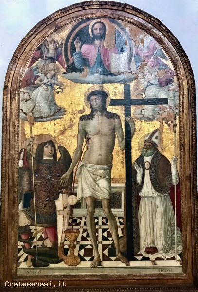 La tavola raffigura Cristo in piedi davanti al suo sepolcro, da cui è risorto, con la croce in mano, mentre il suo sangue sgorga dal costato, che cade in un ciborio deposto a terra, dopo l'avvenuta transustanziazione. Questo mistero è qui rappresentato dal getto di sangue e dall'ostia dipinta posta a metà tra il costato di Cristo e il recipiente. Inginocchiati accanto a lui sono l'Arcangelo Michele e Sant'Egidio. Nella lunetta dell'opera, a completamento della rappresentazione simbolica della Redenzione, Cristo Salvatore dell'umanità appare a mezzo busto all'interno della sfera celeste.
