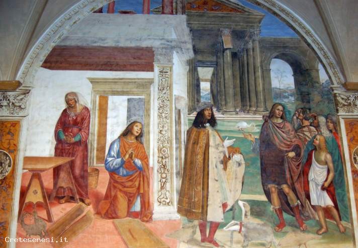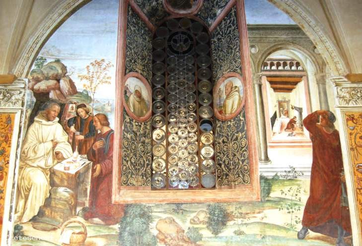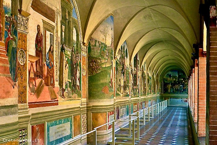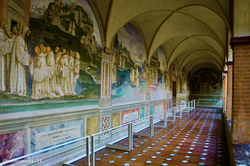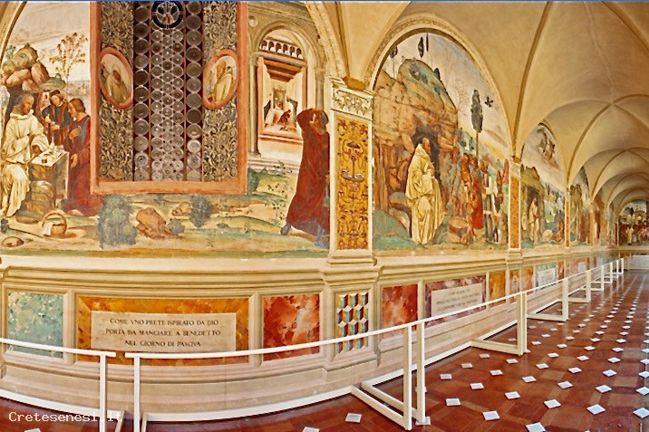 The cycle of frescoes covering the walls of the cloister were first initiated by Signorelli and Sodoma completed at a later date. It is not known until today, the reason why the Signorelli has abandoned in the mid quet'opera great. Is assumed to be the case with orders to seize the opportunity to perhaps the most prestigious and better paid.