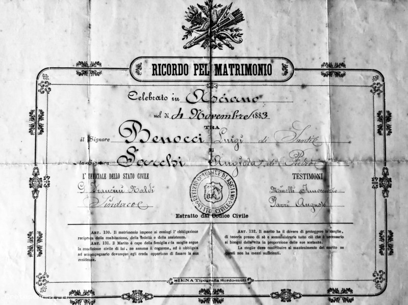 Il documento ci è stato fornito dal nipote dello sposo: Mauro Benocci, ascianese ora residente a Venturina, vicino a Piombino.