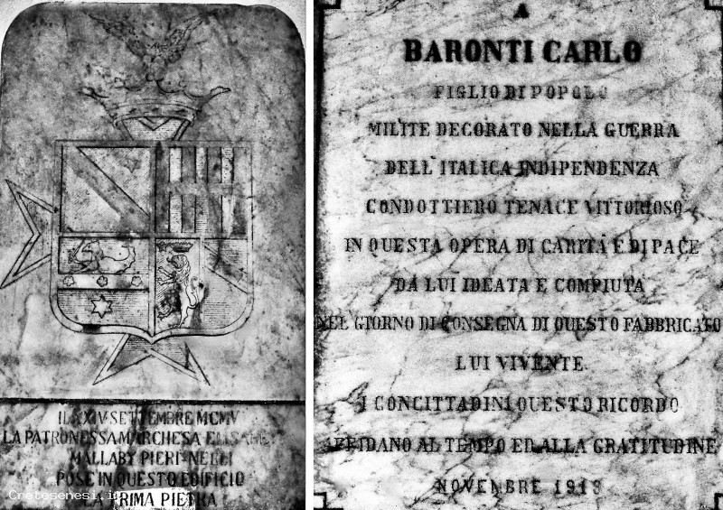 Le due targhe marmoree, tuttora visibili all'interno della Residenza Sociale Assistita di San Francesco, testimoniano il momento di inizio e fine della costruzione dell'edificio che avrebbe dovuto ospitare l'Ospedale Regina Elena, fortemente voluto dal garibaldino Carlo Baronti e finanziato in parte dalla Marchesa Elisabet Mallaby Pieri Nerli.