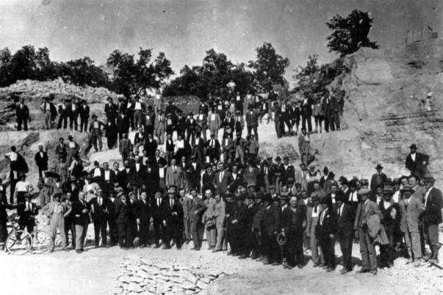 Foto di gruppo fatta per immortalare l'apertura di una nuova cava. A quel tempo, evidentemente, un evento del genere con la conseguente possibiltaà di lavoro indotta veniva considerata una cosa di interesse collettivo tanto da giustificare le autorità locali.