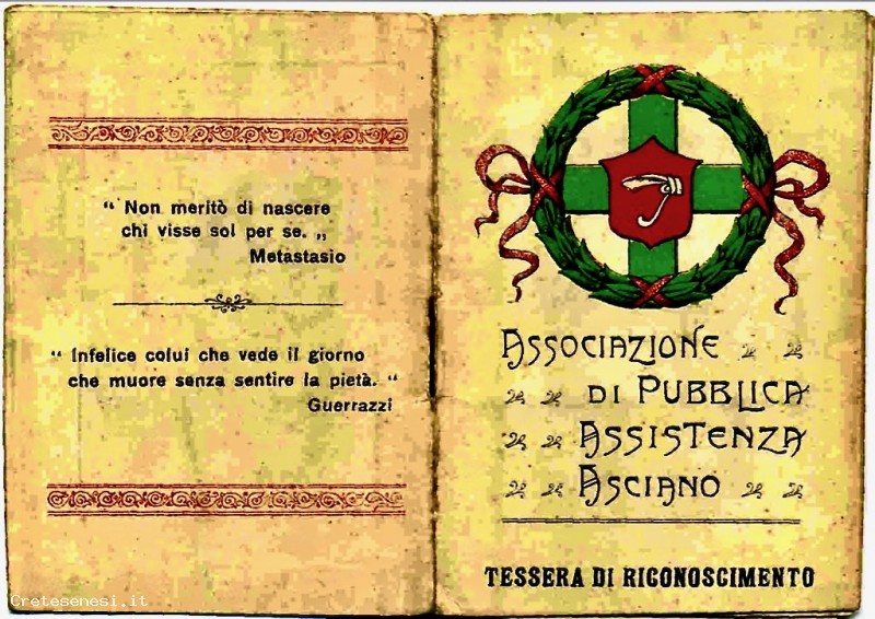 Documento che, oltre a testimoniare l'esistenza della Pubblica Assistenza ad Asciano, in tempi remoti, risulta interessante perché, contrariamente al solito, la Tessera è composta da numerose pagine in cui sono contenute precise indicazioni, il caso di primo soccorso.