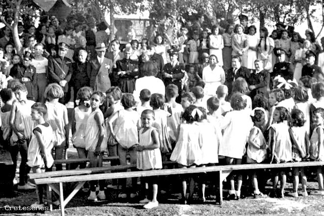 Durante il ventennio fascista, nel periodo estivo, venivano organizzate Colonie Elioterapiche per bambini e ragazzi. Il luogo era lo spazio aperto di San Francesco. A seguire la colonia c'erano una serie di donne adulte denominate "Educatrici" In questa foto, gli esponenti del regime fascista visitano la Colonia. Fra gli adulti siamo riusciti a individuare la maestra Vinci, mamma di Domizio e la signora Fabbri, moglie di uno dei fratelli Fabbri gestori dell'emporio locale.
