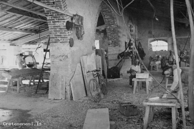 Da notare vicino ad uno scarpellino all'opera l'immancabile bicicletta, unico mezzo di locomozione per muoversi fra casa e il luogo di lavoro.