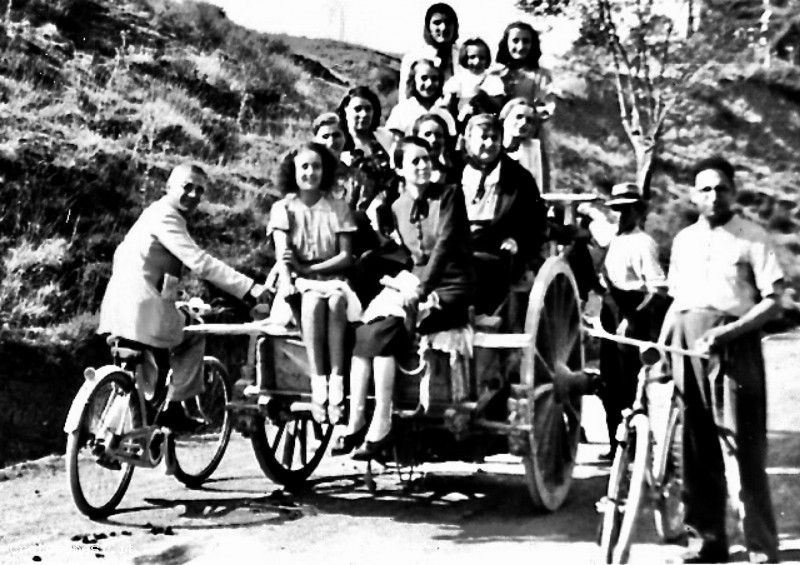L’occasione in cui è stata scattata questa foto, è relativa alla festa della Madonna che, l’otto Settembre di ogni anno, si effettua a Monte Oliveto Maggiore. Per raggiungere l’Abbazia, alcuni abitanti di Asciano, non avevano trovato di meglio che utilizzare il barroccio di Umberto Tozzi, detto Groppone. Alla compagnia si erano evidentemente uniti due giovanotti in possesso di una propria bicicletta.