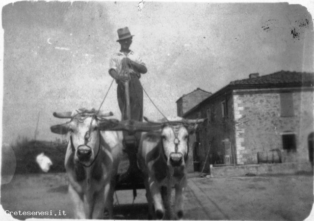 1948 - Contadino alla guida di un carro di buoi di razza chianina Asciano