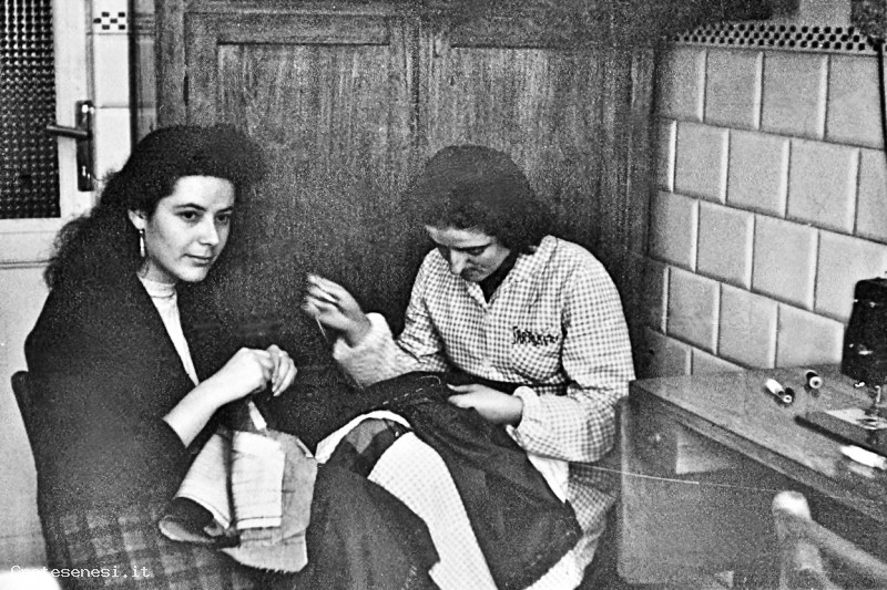 Due collaboratrici della Sartoria Pieri intente a fissare con le filse le parti di un vestito, prima di passare alla fase di cucitura a macchina. Sulla destra si intravede la testa con l'ago di una macchina da cucire a pedale. Le sarte sono: