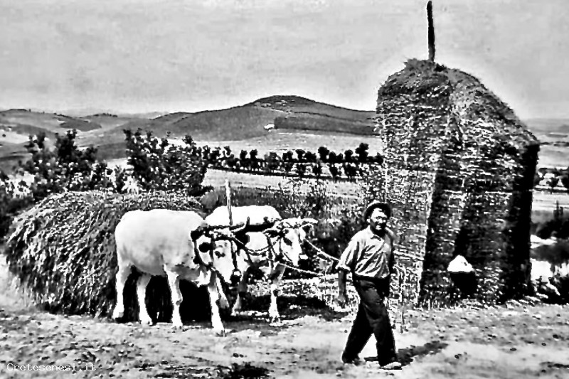 Bellissima immagine di un contadino di Rabatta, podere vicino a Poggiopinci, mentre torna al podere con un carro pieno di fieno fresco e trainato da dui buoi maremmani.