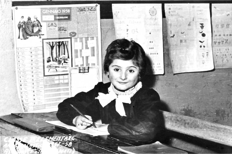Beatrice Mancini, immortalata sul robusto banco scolastico di legno, al suo primo anno di scuola, prima di andare in vacanza.