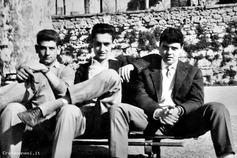 Tre giovani amici si fanno fotografare ai giardini, seduti sotto il grande platano, unico superstite dell'originaria piantumazione di viale Gramsci, al momento della realizzazione del breve tratto dai giardini alla Magione, effettuata negli anni trenta del '900.