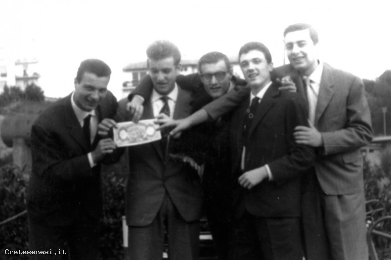 Un gruppo ascianese di studenti "di Chimica del Sarrocchi" che mostrano una banconota da dieci mila lire, con aria molto soddisfatta.
