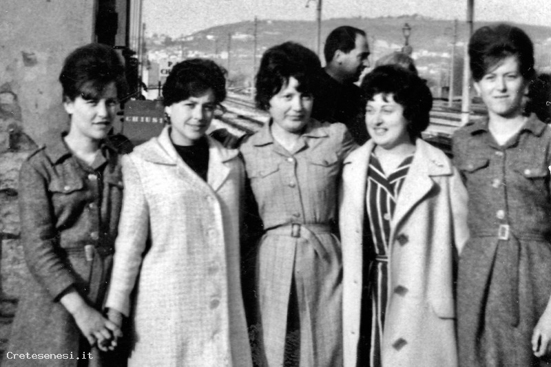 Gruppo di ragazze sul marciapiede della stazione ferroviaria di Asciano Scalo, in attesa che arrivi il treno.