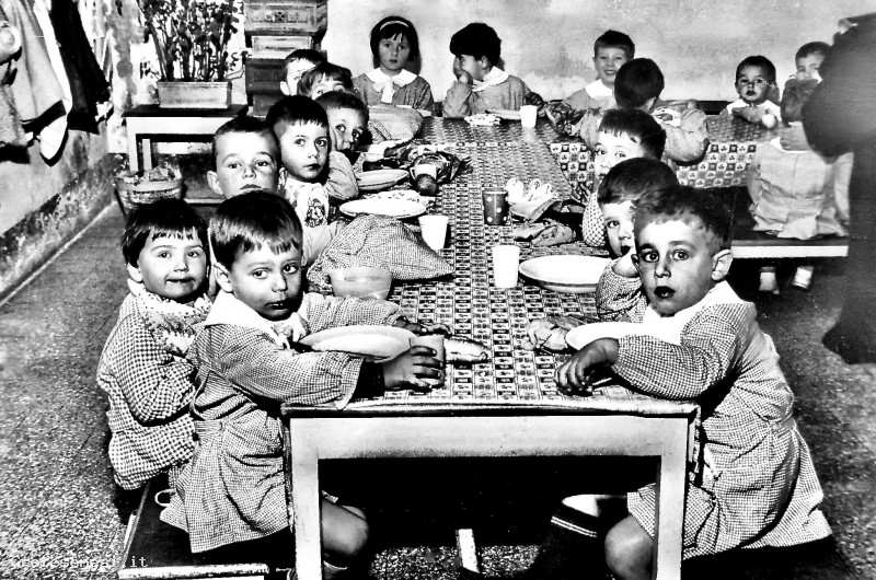 Foto insolita, che ritrae i bambini seduti a pranzo nei locali dell'Asilo Parrocchiale, gestito dalle suore. A quel tempo, non era ancora stata istituita la Scuola Materna Statale.