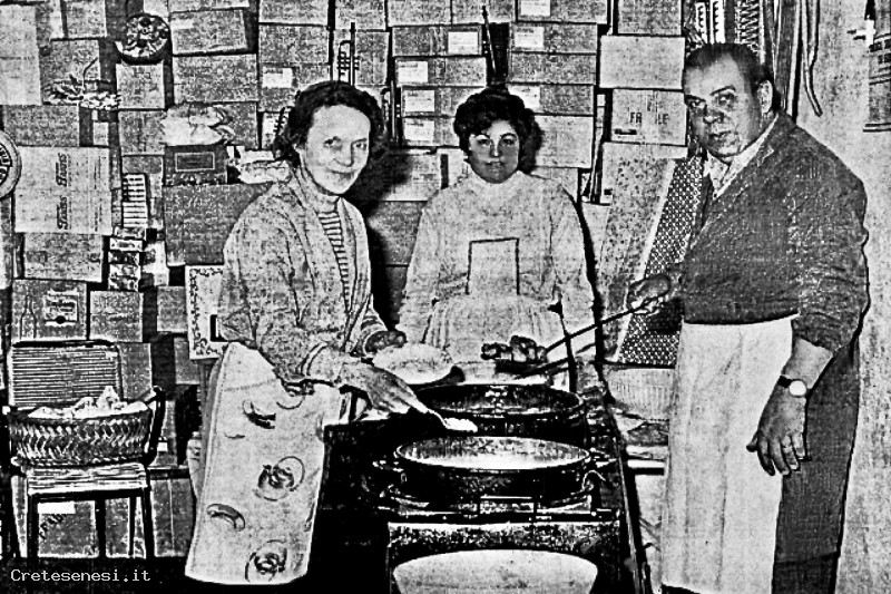 Foto che ritrae la produzione di frittelle da parte di Carlino del Giardi. Questa produzione era legata ai giorni intorno a San Giuseppe. Le frittelle, una squisita specialità della ditta, erano molto apprezzate dagli ascianesi che facevano la fila per acquistarle. La friggitoria veniva allestita nel magazzino del negozio, in via Mazzini davanti alla bottega di Sandra dei giornali.