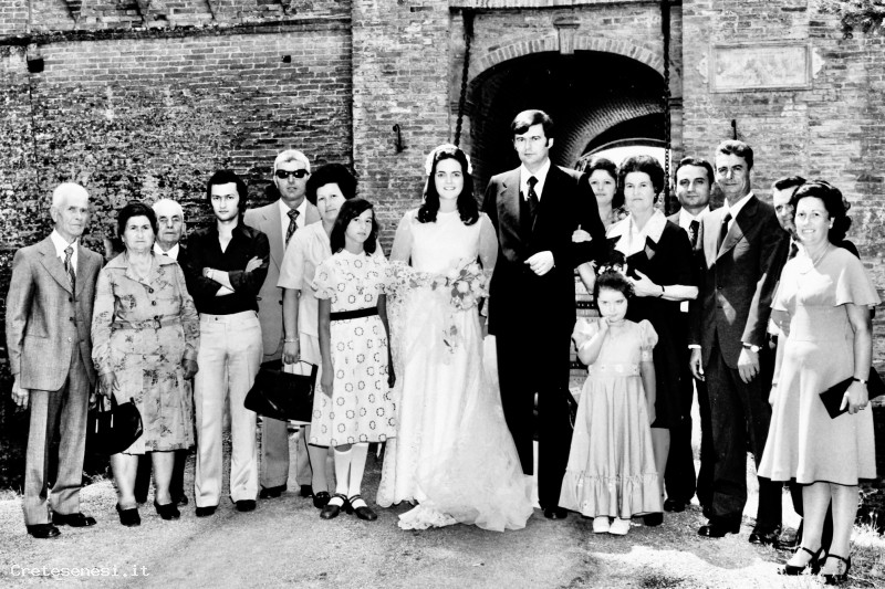 Tutti i parenti dello sposo immortalati in posa dvanti all'ingresso della Torre di Monte Oliveto Maggiore.