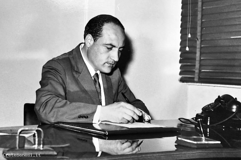 Il Professor Renato Lucatti, seduto alla scrivania appena preso servizio alla Scuola Elementare di Asciano, come Direttore del Plesso Scolastico.