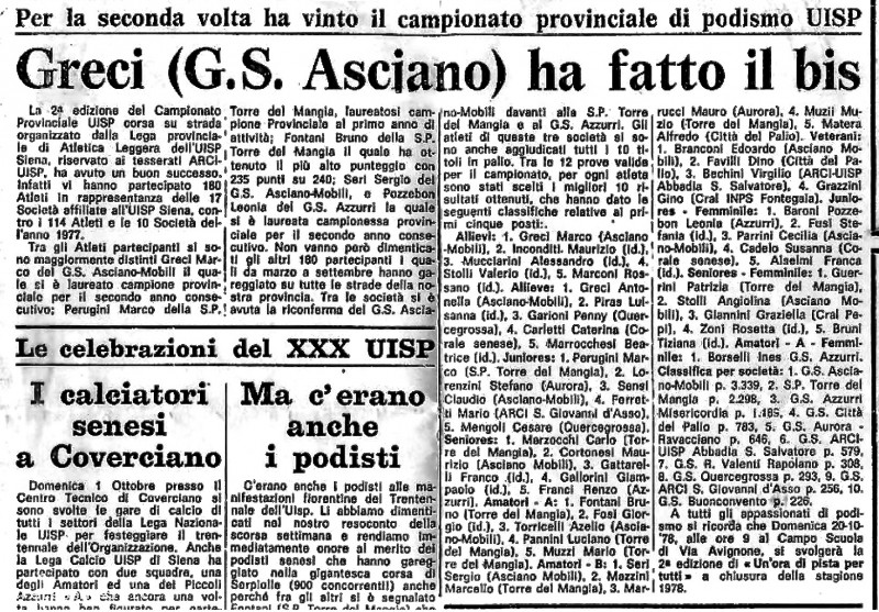 Questo ritaglio di giornale, ci permette di documentare il grande valore competitivo del Gruppo Sportivo Asciano Mobili, in grado di piazzare ai primi posti i suoi atleti in tutte le categorie.