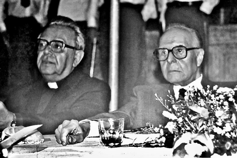 Primo piano di Mons. Bruno Torpigliani e Amos Giuseppe Cassioli, l'ultimo erede della dinastia dei pittori-architetti ascianesi.