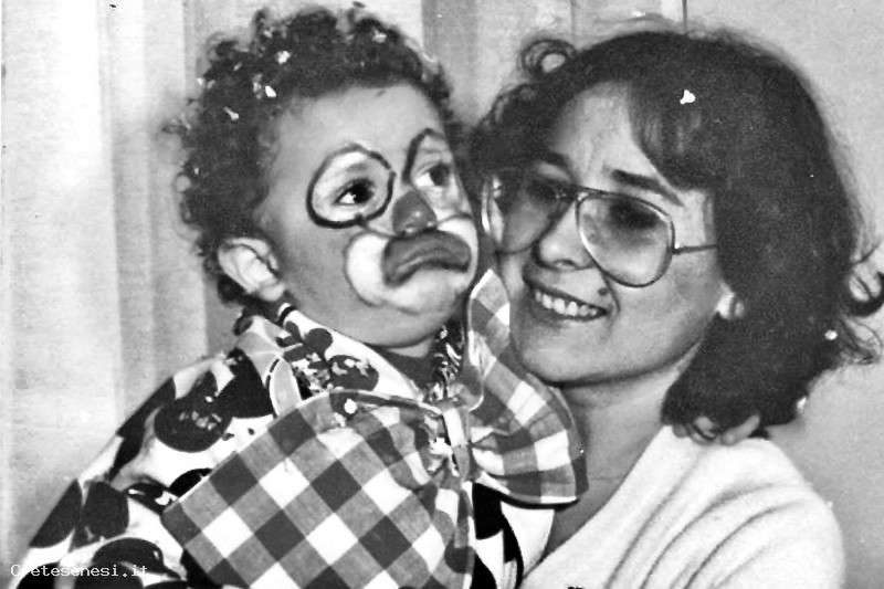 Ombretta Mazzini con in braccio suo figlio Marco Mannucci, vestito da pagliaccio per la festa di Carnevale.