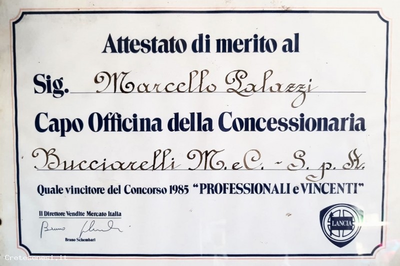 Tutti conoscono la passione di Marcello Palazzi per i motori e il fatto che, di questa passione, è riuscito a farne un mestiere per tutta la sua vita lavorativa, ma questo attestato di riconoscimento di: miglior tecnico della Toscana, dimostra l'alto livello di professionalità che è riuscito a raggiungere.