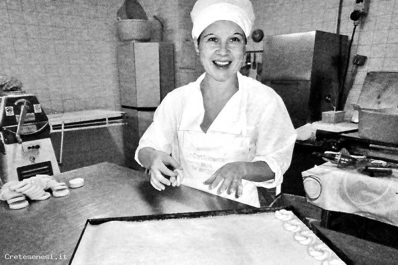 Una delle collaboratrici del Forno delle Crete mentre prepara i pasticcini da infornare.