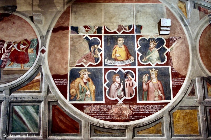 The room, located on the first floor of the building, is among the works of enlargement of the building carried out at the turn of the thirteenth and fourteenth centuries. The great room, which was probably used to study commercial and administration of local justice, presents a colorful decoration faux marble accompanied, in the upper part of the walls, a rich sequence of coats of arms. Within this system decorative decorative, fit three large medallions with figures: Round of Aristotle - The largest of the three paintings on the north wall of the room, is the starting point of the illustration illustrations. There stands a half-bust of Aristotle, identified by a cartouche with. The picture is surrounded by the four Cardinal Virtues (Prudence, Justice, Fortitude and Temperance) and four sides by historical or mythical figures who, in their stories, are an example of the virtues themselves. These are now seriously damaged as well as most of the inscriptions. In quatrefoil below, is depicted a man pointing a hand ax and regent in the background a tower. SSI is certainly a symbolic reference to the town of Asciano. The scene as a whole is intended to enhance the common good that should be the main goal of those who manage the power, as Aristotle teaches, and that is achieved by good behavior, especially in terms of justice. Round of Solomon - The medallion to the left of the "Round of Aristotle" depicts the biblical story of the Judgment of Solomon, enlightened by divine wisdom. The scene shows two mothers who had given birth on the same days and lived in the same house, and that, following the death of one of the two children, they accused each other of having exchanged their dead son live with. Solomon, to prove who the real mother would have divided in half with his sword the child is depicted identifies the natural mother, recognized that in order to save his son, he asks the king to hand begging the other woman. Round of Nebuchadnezzar - Ilprimo Dream of Nebuchadnezzar, narrated by Daniel the prophet, is rappresentatoAlla the right of the "Round of Aristotle." The episode, from the Old Testament, showing what appeared to the king in a dream: a large statue with the head of gold, chest of silver, its belly and thighs of bronze, its legs of iron, its feet partly of iron and partly of clay, is destroyed by the fall of a large boulder. Nebuchadnezzar was troubled by a dream, he summoned all the wise men of Babylon, and condemned them to death because they are unable to interpret the meaning of the dream. Only Daniel, was able to explain to the king that the dream anticipated the fall of his kingdom and the coming of the Kingdom of God in this sense, the Dream wants to mean an example of Christian condemnation riches and greed of those who govern, because destined to an inexorable fall. The iconographic representation continues into the east wall with a spectacular classical Rota Barlaam.
