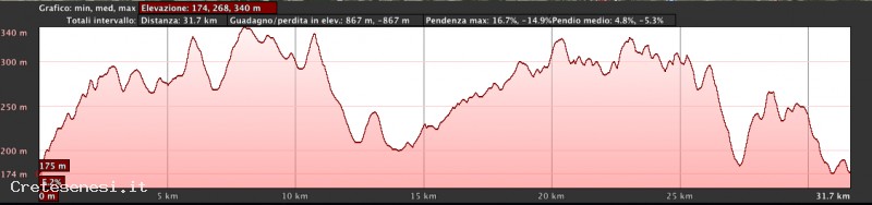 Cyclic path to discover the most beautiful landscapes of Crete, starting from the bridge of Garbo, just north of Asciano. Right onto the dirt road leading to Monte Sante Marie. and reached this ancient village, continue to Torre a Castello, on the left leaving the old church of San Vito in Crete. Along this stretch, is granted having often linger to enjoy the beautiful landscapes of the most beautiful of all Crete. When you get to that, it begins to fall, on a paved road to the junction to Castelnuovo Scalo. Taking on the left is pulled right up to downhill turns that line the highway. Last junction, just before the train station, turn right past the railroad and along the cartodromo. After this, take a dirt road going up partly of clay that leads up to Mucigliani. From here we descend rapidamene until you meet in town Menchiari, the Former Lauretana and turn left towards Asciano. The path now all on asphalt, is characterized by winding climbs and descents, but also unforgettable landscapes. Passing Vescona, the Fontanelle, the small Parish, Montefiori. From here you return to your starting point, facing a series of challenging descents.