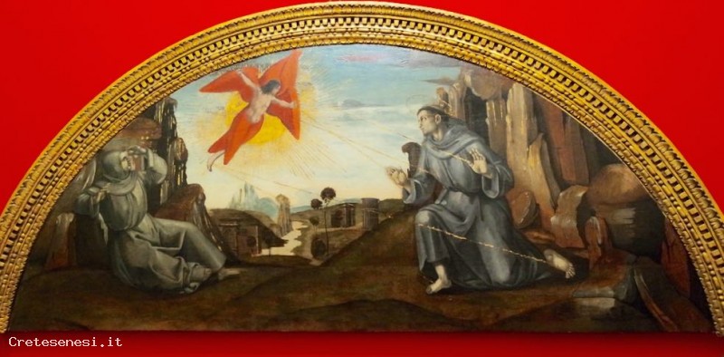 The lunette depicting St. Francis receiving the stigmata is dated around 1510-12, it is due to Luca Signorelli (Cortona 1445 ca.-1523). The scene is composed according to the dictates of St. Bonaventure's biography: the saint is kneeling before a wall of rocks, as his hands, his feet and chest are pierced by golden rays from a creature appeared in the sky, half Christ and Serafino half; at the opposite end is Brother Leo, companion of Francis on the Verna. The bezel comes as suggested by the subject represented, from the Church of San Francesco. For a long time it was considered that the table was the only surviving part of the 'closet commissioned to Luca Signorelli to protect the Golden Tree, but it has been shown that it is rather an altarpiece.