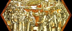 Hex center you can see the figure of King Ahab and Elijah left to right, surrounded by two symmetrical wings of characters. The figures are tall and slender, with fine clothes, especially the royal has turban, wide sleeves and fur seals. Elijah is pointing to a hill where there is a tree dried up due to drought and where they are dragged two oxen to sacrifice: one will be offered to Baal and the other by his priests to God of Elijah, so that the king, in the presence of all the people can see what true worship is and what a dummy (I Kings, 18, 17-19). In the background you can see the walls of the city. This was the last hex to be executed by Beccafumi, whose payment was made June 18, 1524. In this marquetry artist modules scenes footage of the fifteenth floor, using a sky of marbles blacks.