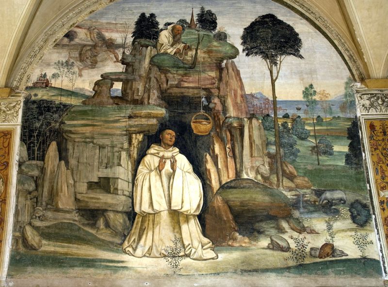 St. Benedict is praying in front of a cave while overhead a monaco drops a jar with the food, but the rope is attached to a bell that sounds the way down but the devil with a stone breaks it. Very beautiful landscape.