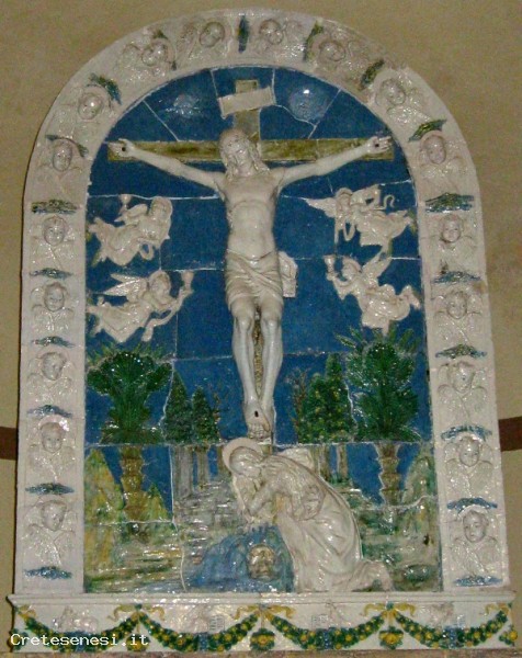 Great relief, glazed ceramic, ending arc at the top. Inside there is represented a crucifixion with Mary Magdalene at the foot of the cross, kneeling in prayer Particularly striking, the palm trees as a backdrop.