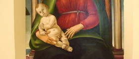 La Madonna in abiti semplici siede sotto una cupola, tenendo fra le braccia il Bambino.