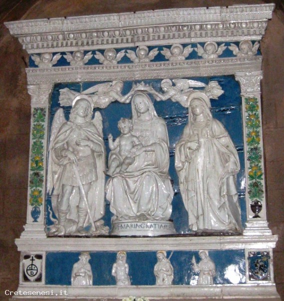 Altarpiece with a rectangular platform. In the center is the Madonna and Child raffighurata breccia, in the middle of St. Michael and St. Catherine of Alexandria. The lady is on a pedestal trva collcata where it says: Virgin Mary full of grace, obviously in Latin. In the predella are represented four other Saints.