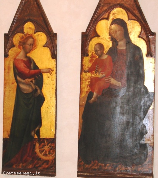 Due pannelli cuspidali facenti parte di un grande polittico smembrato e raffiguranti, rispettivamene di santa Caterina d'Alessandria nel pannello più piccolo e la Madonna in trono col Bambino, nell'altro. Degli altri pannelli componenti il polittico si sono perse le tracce. Alcuni esperti sostengono che altri 2 pannelli dello stesso polittico sarebbero quelli conservati nella Chiesa parrocchiale di Civita Bagnoregio.