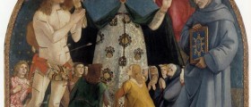 This altarpiece of the Madonna della Misericordia in the company of San Bernardino and San Sebasiano, after a first allocation to the Sienese Pietro di Domenico, is then recognized as the work of Signorelli. The board seems to have been painted immediately before (1487-1494) the completion of the cycle of frescoes in the Cathedral of Orvieto. Its original location seems to have been the headquarters of the Society of Mercy of Montepulciano. Originally it was to be linked to the dais in the Uffizi, in which are depicted: The Annunciation, The Adoration of the Shepherds and the Adoration of the Magi, as documented from Montepulciano. The not excellent quality of the implementation of the angels is interpreted as the work of employees of the master's workshop. In addition, the loss of gloss in some parts of the work is attributable to a long period of poor preservation of the table.