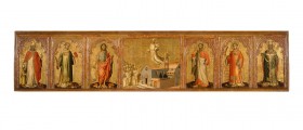 In addition to the qualitative value of the painting, the work of the Sienese painter Martino di Bartolomeo, the painting is striking for the singular layout of the central panel which shows the viewer a small cross-section of Siena in medieval times. The scene, which has as its subject a miraculous apparition of the Madonna, is set on the streets of the city in front of the church of San Pietro alla Magione at Porta Camollia for which the painting to which the predella in question belonged was certainly executed. The Virgin and Child hover above the church in front of which a group of confreres dressed in white and with hoods on their heads witness the miraculous event. The symbol of the cross is found on the robes, hoods and belts of the confreres, members of one of the many lay companies dedicated to worship that have flourished in Italy since the beginning of the thirteenth century: they are, in all likelihood, belonging to the Confraternity dei Bianchi, religious movement born in Chieri in 1399 during the war between Savoy and Monferrato. The movement of the whites spread rapidly to the other regions of the peninsula and the penitents, in white robes on which a red cross stood out, traveled through Italy to bring the fighting cities back to peace; the movement became extinct in the 1400s due to the plague. Characteristic of Martino di Bartolomeo's painting is the adoption of a humanity with polite and elegant gestures: the elegance of the rhythms and the firmness of the shapes derived to the painter from a skilful formal synthesis between the refined variations of the Sienese tradition and the large and vigorous volumes peculiar to the style of Spinello Aretino and Antonio Veneziano, two of the major exponents of the Italian artistic panorama of the late fourteenth century.