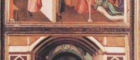 Nel "Regalo della dote a tre vergini" si vede l'interno di una casa -tramite un loggiato- in cui stanno tre donne con l'anziano padre, per la povertà egli aveva manifestato il proposito di avviarle alla prostituzione ma il santo, affacciato dalla finestrella sulla sinistra, le salva tirando loro tre astucci dorati.
