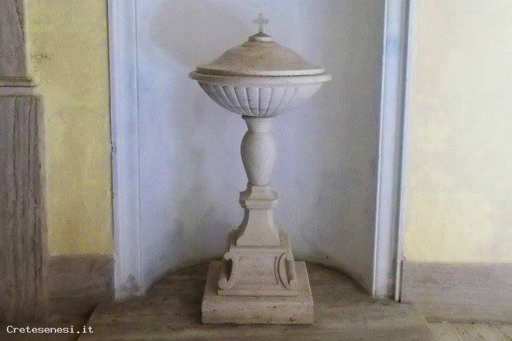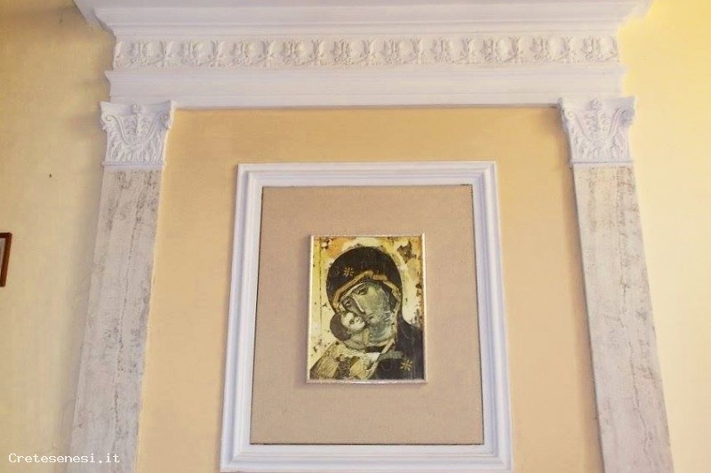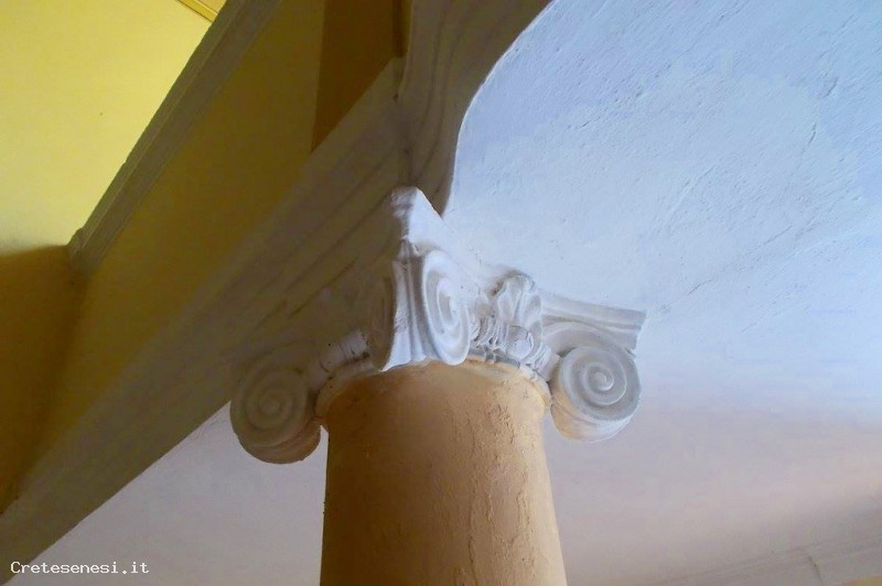The interior is plastered, while all the fixed furnishings are made again in travertine. Above the entrance is a chorus, supported by two columns plastered with Doric capital.