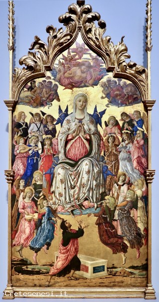 This magnificent and imposing vision of the Virgin Mary’s body and soul being taken to heaven was the central panel of a large polyptych (a multi-panelled altarpiece). It was made for the monastery of Sant'Agostino in Asciano, in the countryside near the Tuscan town of Siena.