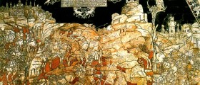 The first scene we find is the Expulsion of Herod, great scene designed in 1485 by Benvenuto di Giovanni (restored in 1869-1878), surrounded by a fine frieze made up of pairs of lions separated by a frieze, designed by Sebastian Francis in 1484. The subject is taken from the Jewish Antiquities of Josephus, the text of which is shown in the table, made in the middle of the dark sky and supported by four angels in flight. At the center of the scene is dominated by the depiction of a fierce battle, this is a very rare iconography of Siena. The historical city of Siena and left looks like its walls. Representation in the leading position of the eagle's nest attacked by a snake, in the center near the fortress, is probably a reference to the events of 1482 relating to the expulsion of Pandolfo Petrucci from the city.