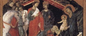 Tempera su tavola,  cm. 42,5 x 43,5. In questa tavola, che chiaramente richiama le iconografie dell'arte bizantina, si percepiscono, soprattutto nelle figure - compresi i cavalli - poste al lato sinistro, preludi di notazioni da società 'cortese'.