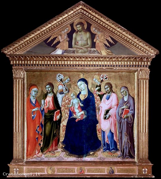 The large painting, created on a single surface and with a small temple-like upper section, resembles the external structure of the nearby Assumption of the Madonna by Vecchietta, located in the Cathedral.