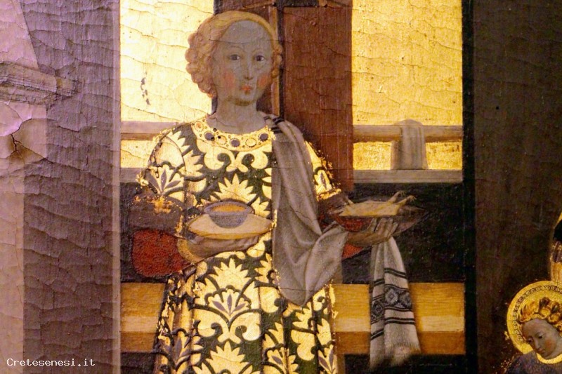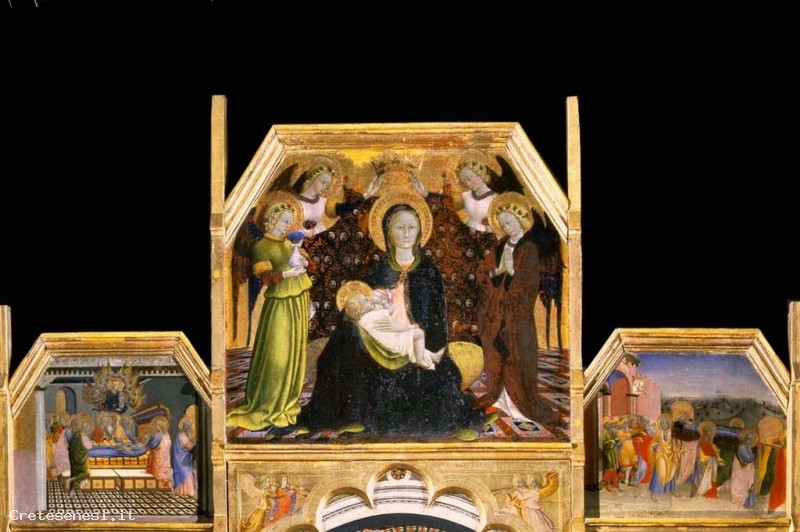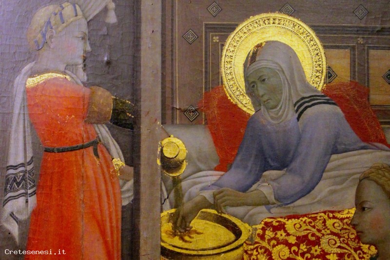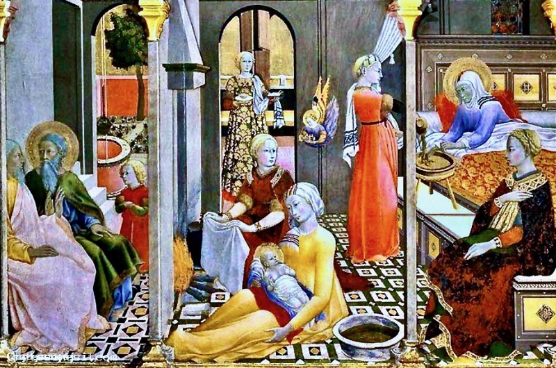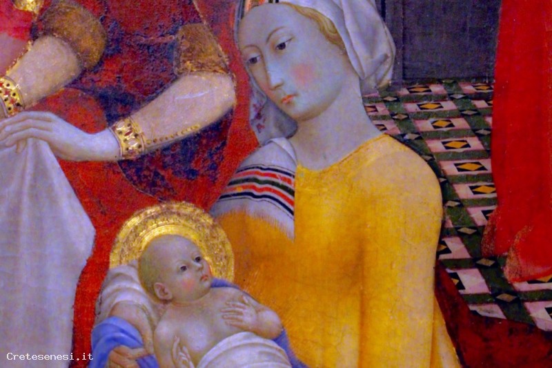 Tempra on wood, 222x172, 5 cm. It 'an altarpiece dating from around 1430, painted in tempera on wood by an artist still uncertain attribution. "Master Observance" is the conventional name chosen by Alberto Graziani (pupil of Roberto Longhi) to define this "noble artist, of a parallel culture to that of Sassetta but more insistently archaic." Angelini also argues that it is "an artist akin to Sassetta, but more deeply nourished by the juices of tradition" (Sienese Painting-Federico Motta Editore). And the Encyclopedia of Art Garzanti we read: "The Master Observance enriches the tradition of Sienese Gothic notations detailed naturalistic and lively atmosphere marked in gold" Although the exact identification of the artist has not yet reached a substantial understanding among scholars, we know for sure that the "Master Observance" was one of the protagonists of the fifteenth-century painting in Siena. In this altarpiece of the "Nativity of the Virgin" is represented a domestic environment of Siena at the time, with a good dose of imagination that makes everyday life more fabulous. A sort of "Good Government" of the family, where everything is documented in detail and is exactly in its place: rich, poor, servants, infants and visitors. Unlike today, in those days the rulers and powerful reasoned much and City Governments "ideal", and in this context this could probably be considered a domestic life "ideal" of those times. What a breath of fresh air and poetry, in painting this bright, clear, relaxed, full of tenderness, love and peace! Retrieved from: http://www3.varesenews.it/blog/labottegadelpittore/?page_id=2