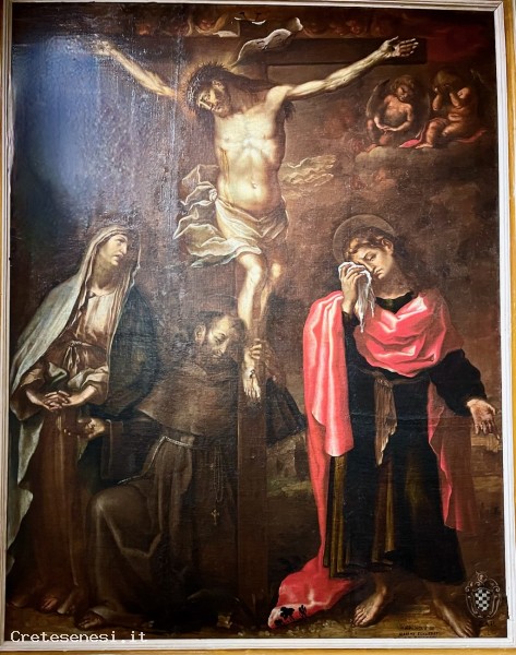 The canvas, created in 1664 for the Church of San Francesco, where it was placed over the second altar on the right, documents a new phase in the artistic evolution of Francesco Nasini, who four years earlier, also in Asciano, had painted the frescoes "Scenes of the Passion of Christ" in the lunettes of the Oratory of Santa Croce. Compared to this fresco cycle, the "Crucifixion" from San Francesco is characterized by strong color tones and chiaroscuro contrasts, undoubtedly derived from the direct influence of the paintings of Mei and Manetti visible in Asciano.