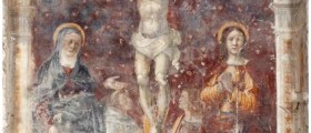 The niche obtained in the thickness of the wall located on the left wall just before accessing the presbytery area it was not visible at the time of Brogi, having been rediscovered only under restoration. Its obstruction must have occurred after 1668, since Nuti referred to the fresco inside with the Crucifixion with the mourners and Saints Francis and Sigismund in relation to a small untitled altar. Peruzzi, continuing his "visit" counterclockwise after the chapel of San Lorenzo, comes across the altar of the Crucifix, under the patronage of Nardini, before that of the Immaculate Conception in the center of the left wall: therefore it is possible to identify it precisely with this niche, also given the subject depicted, the work of a painter very close to the young Sodoma of the early sixteenth century.