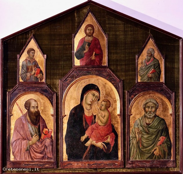 The triptych, originally from the church of San Pietro in Villore in San Giovanni d'Asso, was sold to the Contini Bonacossi couple in 1938 by the Gori-Pannilini family, who held the patronage of the oratory.