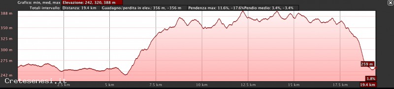 Path of limited difficulty characterized by wide flat stretches in the first part. Departure is from the junction of Lucignano d'Asso, where you can safely park, for Torrenieri along the Cassia, mainly in the plain path which follows the course of the Asso. At the junction of Torrenieri, turn left again abandoning the path of Cassia. Cross the bridge and go uphill sull'Asso facing a series of switchbacks. At the second intersection, turn left for Bellaria, and Celamonti Cosona, along a dirt road from which you can see beautiful scenery on both side and on that dell'Orcia Asso. From Cosona continue through a long tour Lucignano d'Asso, a beautiful medieval village. After a possible refreshment stop in the local Bar-Food, it descends rapidly through a series of curves, to reach the starting point.