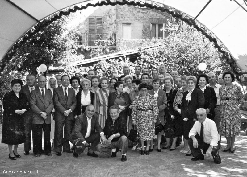 Foto ricordo degli invitati al pranzo di nozze nello spazio all'aperto del Ristorante Cannelli.